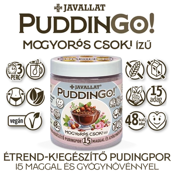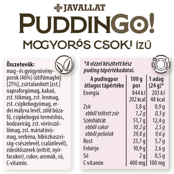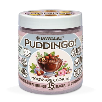 15 adag mogyorós csokoládé ízű, mag- és gyógynövényalapú, élelmi rostban és fehérjében gazdag, vegán, glutén-, laktóz- és tejfehérjementes étrend-kiegészítő pudingpor.